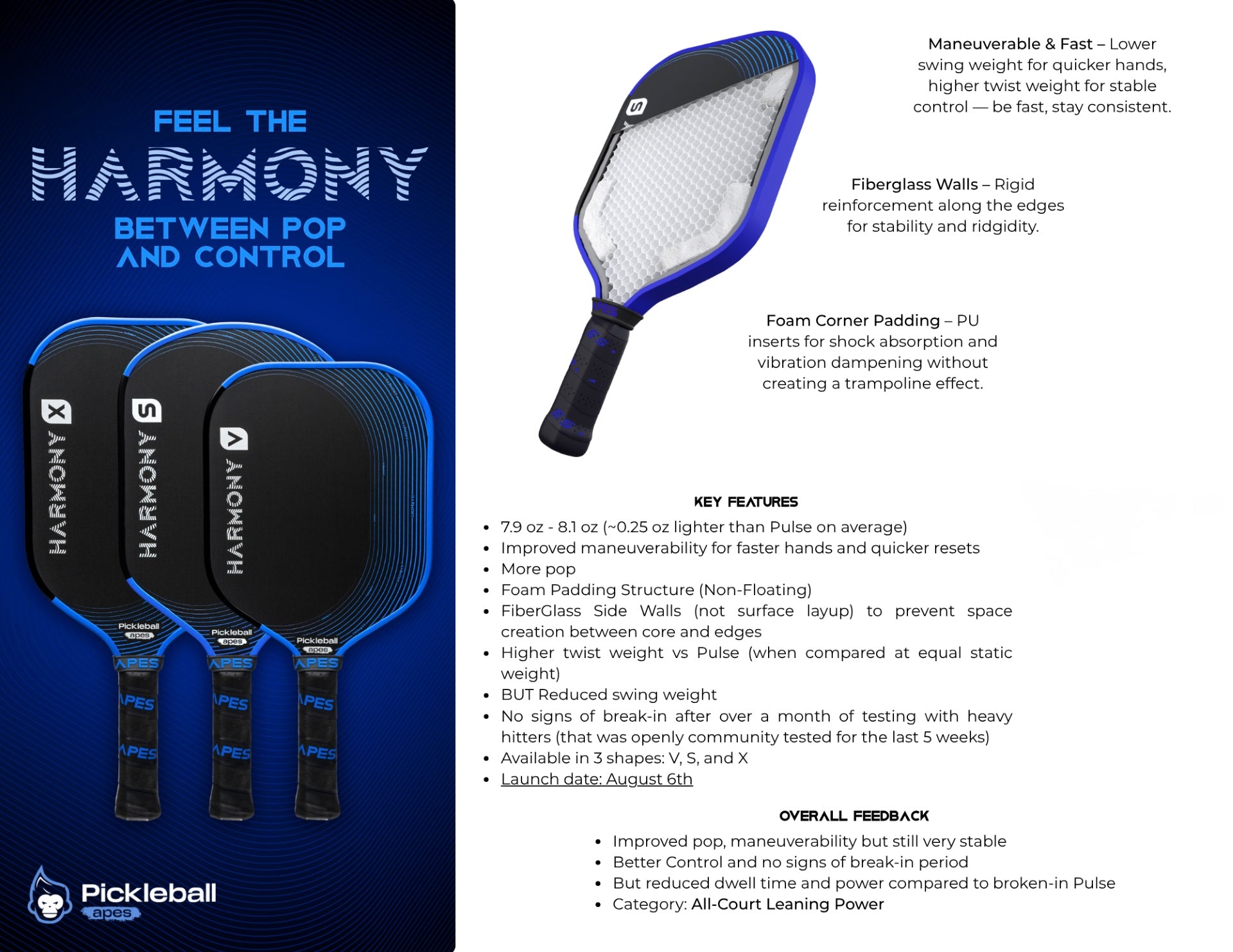 Unlock effortless control and comfort with the Pickleball Apes Harmony V, a widebody paddle designed for players who value soft touch, spin, and forgiveness. Built with a thick 16.5mm honeycomb polymer core, the Harmony V also includes PU foam padding and fiberglass wall reinforcements—enhancing vibration dampening, sweet spot size, and edge stability.